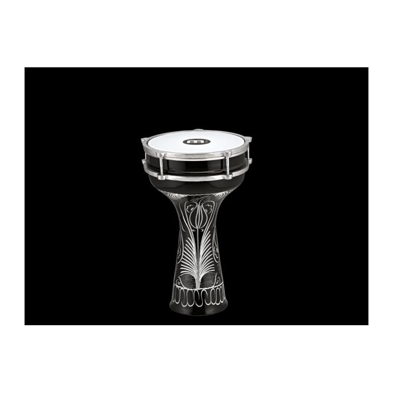 DOUMBEK 'Darbouka 8' 'X 14 1/2' '. Turkish style. Made of aluminum. With replaceable synthetic patch (Part not included). Finished in black and engraved with floral motifs made by hand.