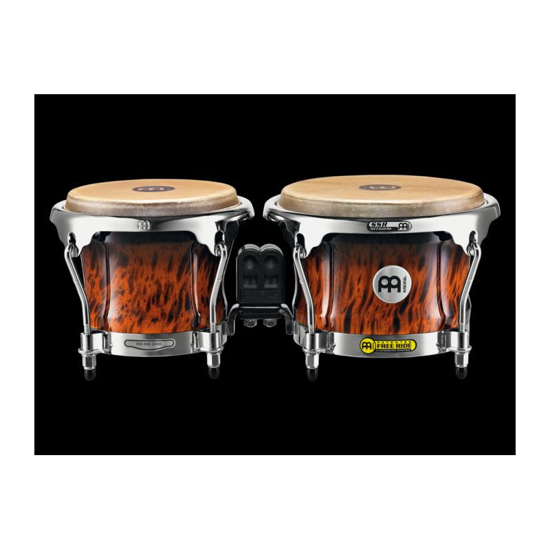 BONGOS 'Set of bongos finished Brown Burl (7' 'and 8 1/2' '). Professional Series. An excellent bongo with the innovative Free Ride system that does not pierce the hooves thus increasing resonance and volume. The body is in Siam oak wood and the patches of hand-selected buffalo leather. In addition they mount a patented and plastic central piece that allows a total fastening to the bongo foot if required.