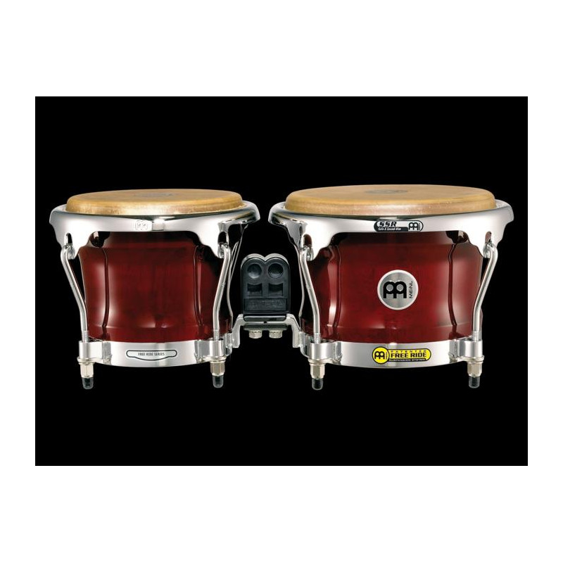 BONGOS 'Cherry Red finished bongos set (7' 'and 8 1/2' '). Professional Series. An excellent bongo with the innovative Free Ride system that does not pierce the hooves thus increasing resonance and volume. The body is in Siam oak wood and the patches of hand-selected buffalo leather. In addition they mount a patented and plastic central piece that allows a total fastening to the bongo foot if required.