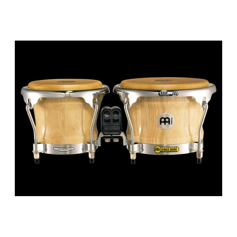 BONGOS 'Natural finish bongos set (7' 'and 8 1/2' '). Professional Series. An excellent bongo with the innovative Free Ride system that does not pierce the hooves thus increasing resonance and volume. The body is in Siam oak wood and the patches of hand-selected buffalo leather. In addition they mount a patented and plastic central piece that allows a total fastening to the bongo foot if required.