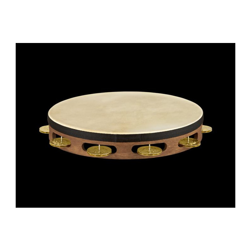 LADDER WITH PATCH '10' 'wooden tambourine with prestressed natrual patch and 1 row of hammered brass rattles. Wooden tambourine 25.4 cm in diameter. Vintage design, finished in walnut brown.
