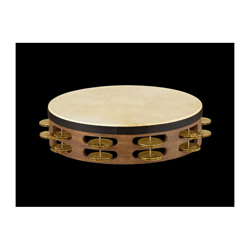 LADDER WITH PATCH '10' 'wooden tambourine with prestressed natrual patch and 2 rows of hammered brass rattles. Wooden tambourine 25.4 cm in diameter. Vintage design, finished in walnut brown.