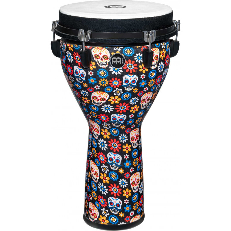 DJEMBE Created with a deep bass tone with a free resonance as its most determining point, the Meinl Jumbo Djembe tries to obtain big sounds with all-weather materials. Available in a variety of diameters, these djembes produce a remarkably wide range of tones, from booming bass to treble. The 100% synthetic head and shell do not go out of tune with changes in temperature or humidity and combine to deliver crisp, clear highs and robust bass. The lightweight construction makes this djembe an ideal travel companion. An easy-to-use mechanical tuning system is anchored by heavy-duty hardware to ensure consistent, reliable sound. Whether at home, on stage or in a studio, the Jumbo Djembe is also perfect for use in classrooms and workshops.