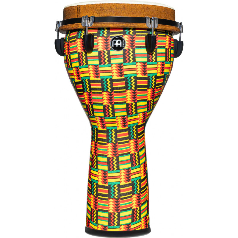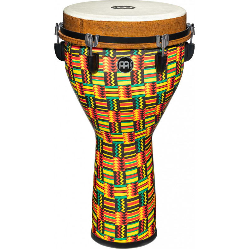 DJEMBE Created with a deep bass tone with a free resonance as its most determining point, the Meinl Jumbo Djembe tries to obtain big sounds with all-weather materials. Available in a variety of diameters, these djembes produce a remarkably wide range of tones, from booming bass to treble. The 100% synthetic head and shell do not go out of tune with changes in temperature or humidity and combine to deliver crisp, clear highs and robust bass. The lightweight construction makes this djembe an ideal travel companion. An easy-to-use mechanical tuning system is anchored by heavy-duty hardware to ensure consistent, reliable sound. Whether at home, on stage or in a studio, the Jumbo Djembe is also perfect for use in classrooms and workshops.