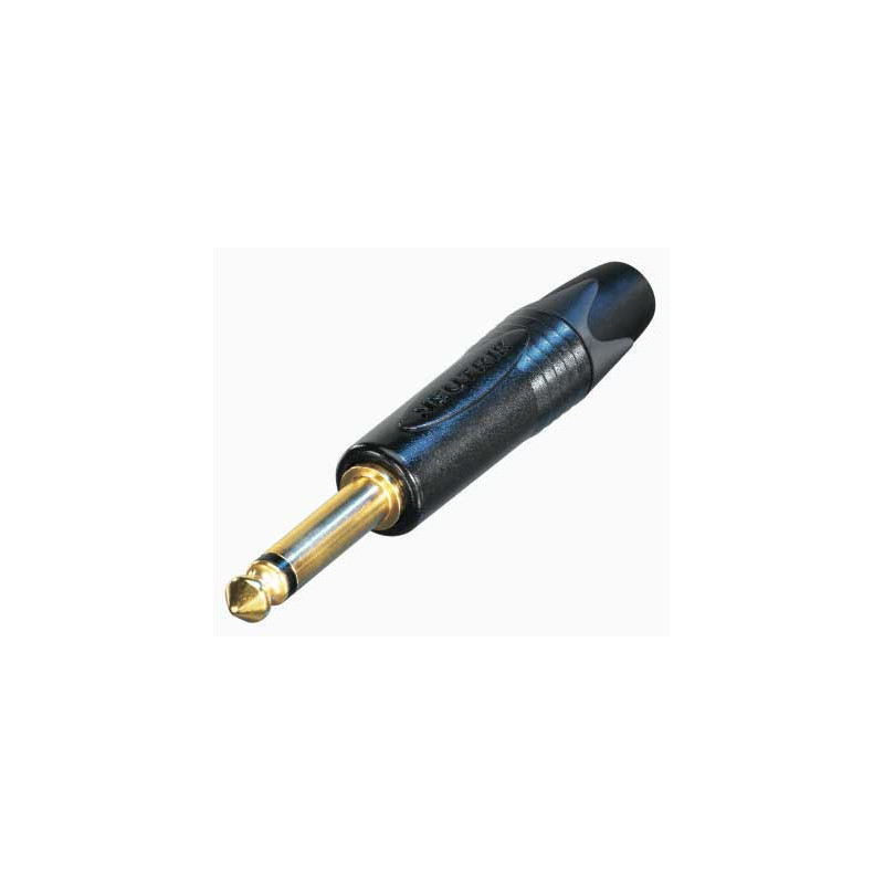 'Professional 2-pole 1/4'' telephone connector, gold contacts, black housing. The heavy duty professional telephone connector series improves on the design of the existing C series by offering the 1/4'' connector of Thinnest A gauge available on the market, with Neutrik's exclusive chuck strain relief. The slim housing with a width of 14.5mm meets the latest requirements for high-density patch panels (15.88mm spacing between connectors). The tip contact precisely machined in one piece, without rivets, makes it unique and prevents snagging on a plug or breaking the tip. The X series connectors fit all applications such as guitar applications, audio cables, snakes, speakers, amplifiers and mixing consoles.'