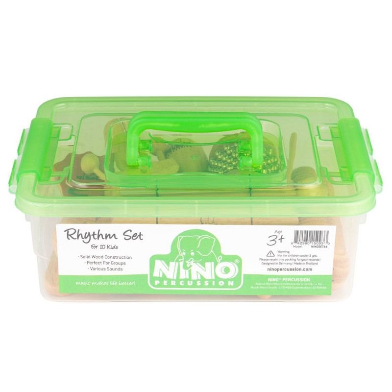 HAND PERCUSSION PACK Get a variety of percussion sounds in one set with Nino Percussion Mixed Rhythm Sets. This set contains a mix of pieces designed to help teach young musicians about percussion with the practical use of real, fun-to-play rhythm instruments. Ideal for the classroom or at home. Suitable for 10 children. ) 1x Wooden Güiro Shaker (NINO520) 1x Cabasa, small (NINO701) 1x Energy Bell, small (NINO579S) 1x Storage Container Box Dimensions: 27.5 x 20 x 9 cm 10.8” x 7.9” x 3.5” For 10 children Recommended age: 3+