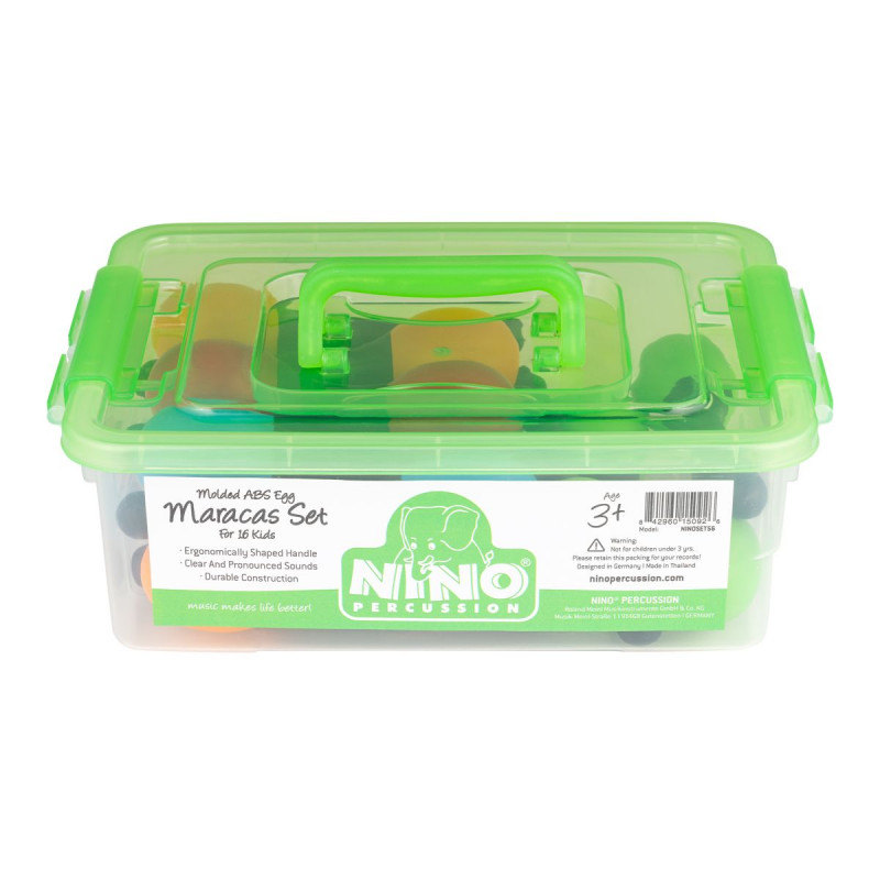 PLASTIC MARAKS Nino Percussion shaker sets combine different shaker shapes, colors, and sounds that are great for classrooms or playing at home. It's easy to create rhythm with these shakers and they're fun for groups. Its durable all-weather synthetic construction is built to last. Suitable for 16 children. Includes: 4x Egg Maracas, grass green 4x Egg Maracas, sky blue 4x Egg Maracas, orange 4x Egg Maracas, red 1x Storage container Material: Molded ABS Case dimensions: 27.5 x 20 x 9 cm 10.8” x 7.9” x 3.5” For children 16 years and older Age recommendation: 3+