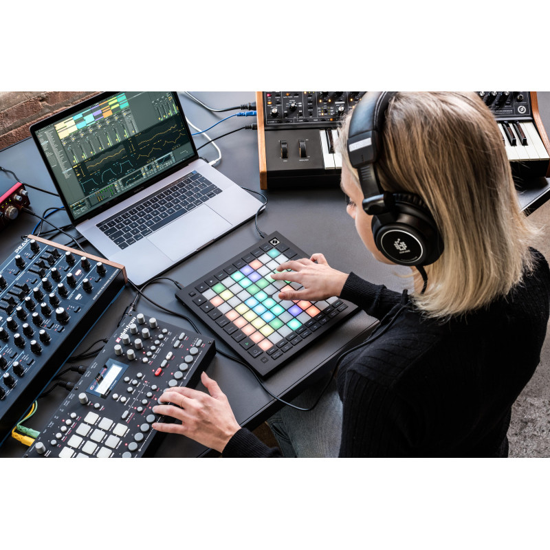 PAD DAW' CONTROLLER. Grid controller for Ableton Live. Full integration with Ableton. 64 large RGB pads that are super-sensitive to pressure and velocity, perfectly reflecting your Ableton Live session. Powerful 4-track, 32-step sequencer, with 8 motes of polyphony, pattern and scene chaining, and probability and mutation controls. Chord mode and dynamic Note and Scale modes for effortlessly playing perfectly in-tune basslines, melodies, chords and lead parts. Automatic charging of battery racks on the grid. MIDI In, Out and Thru. Access from the unit to the Capture MIDI function of Ableton Live. 8 custom modes using Novation Components. Elegant, light and resistant and powered by USB-C. Easy start-up tool and step-by-step video guides to start making music in minutes. Novation 2 year warranty. Includes Ableton Live Lite, two-month Splice Sounds membership, AAS Session Virtual Synth Pack, XLN Addictive Keys Virtual Keyboard, Klevgrand R0Verb Effects Plugins and DAW Cassette, Softube Time and Tone Plugin Pack, and platform access Sound Collective.