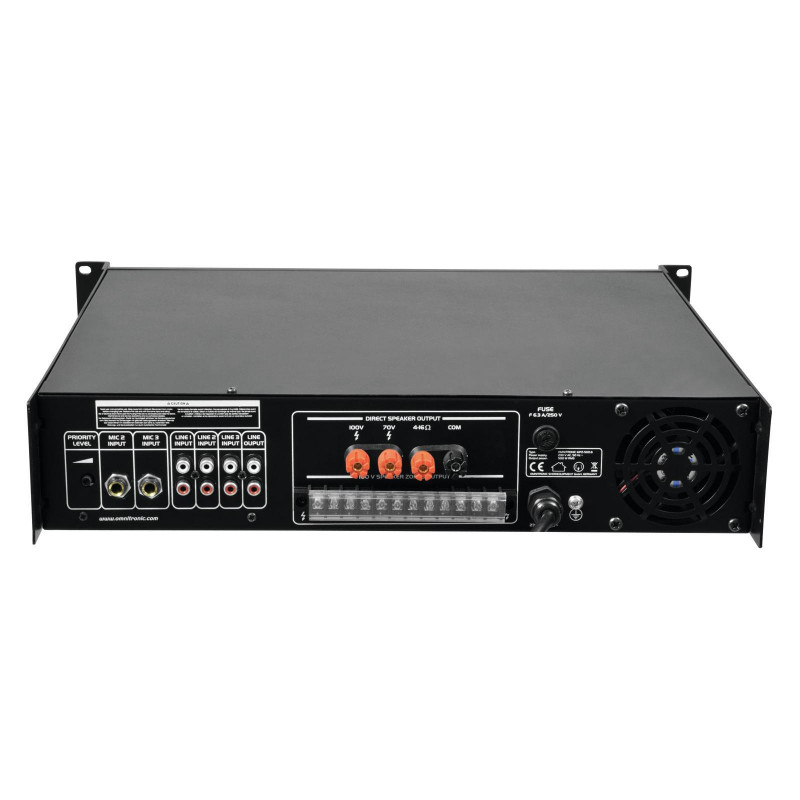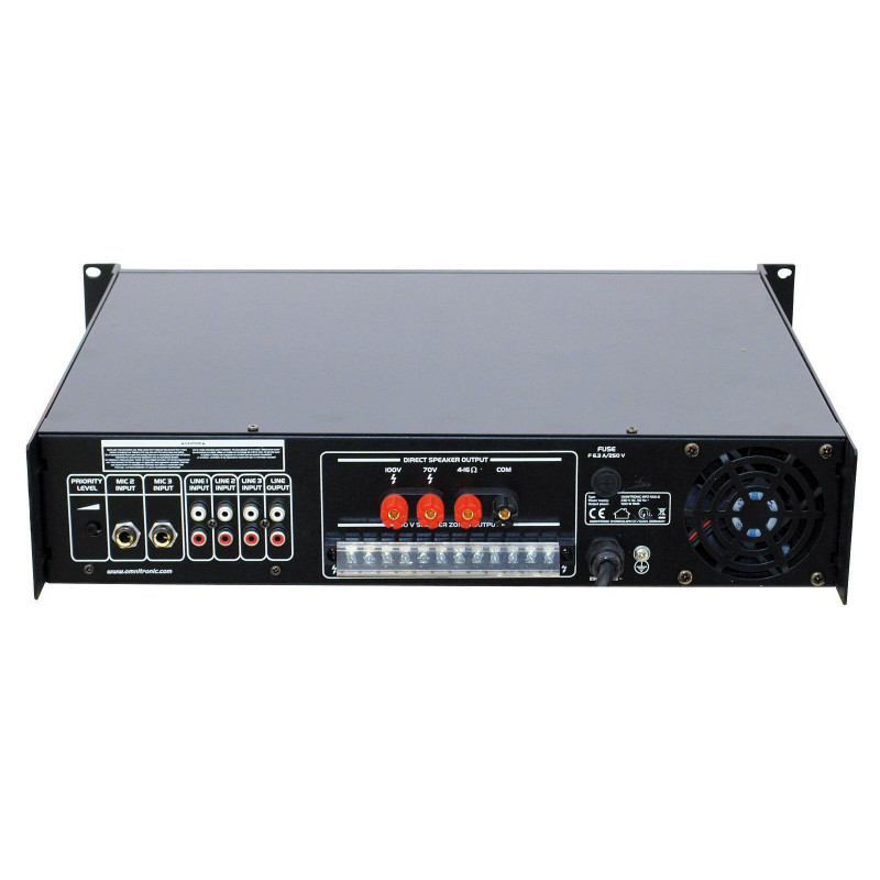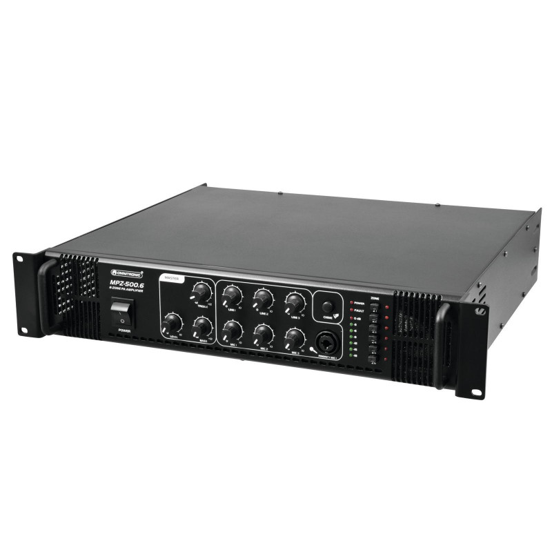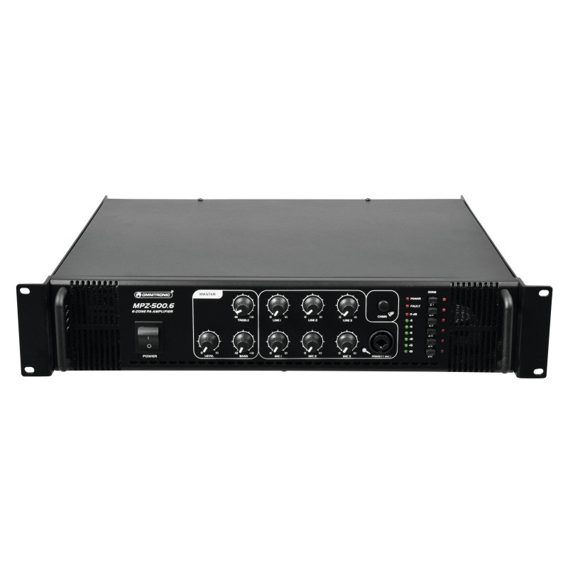 Enormous reliability with a maximum of flexibility The Omnitronic MPZ-500.6 ELA mixer amplifier is your reliable partner for ELA sound reinforcement systems. Thanks to its 19" format, it is ideally suited for both mobile and permanent installations. Outputs for ELA loudspeakers with 70 V and 100 V audio transformers or 4-16- Ohm loudspeakers leave nothing to be desired. In addition, you can also connect a device with line level (e.g. mixing console) to the line output. With 6 mixable inputs you are always flexible. Connect up to 3 microphones and 3 line level devices. Control your ELA speakers conveniently via the 6 zone outputs of the MPZ-500.6. They can be switched separately on the front panel. For you, this means the greatest possible adaptability when implementing your sound reinforcement concept.Make yourself heard! The microphone input at the front has an adjustable priority switch. It allows you to make important announcements with automatic, continuously adjustable level reduction of all signals. You can also use the gong to draw attention to your announcement. Protective functionsA fan protects the interior of your MPZ-500.6 from overheating. In addition to a switch-on delay, it has protection circuits against overvoltage and short-circuits. In these cases, your loudspeakers are electrically isolated from the amplifier. This protects both the MPZ-500.6 and your speakers from damage.