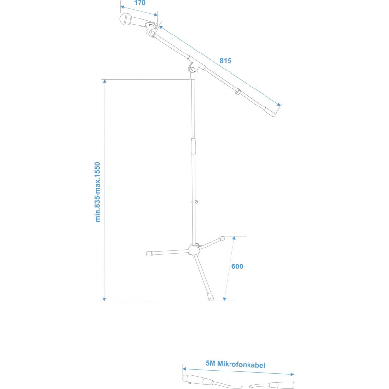 - Set consisting of one microphone, 5 meter microphone cable, one microphone stand, one microphhone clamp and a nylon bag