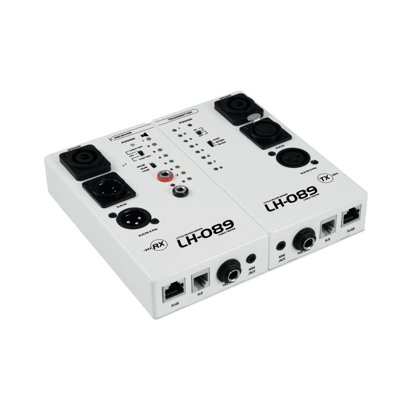 The LH-089 by Omnitronic is designed for testing a large variety of standard audio and data cables with ease. It is an indispensable helper for musicians, sound and stage technicians. Each pin of the connected cable is individually tested and the assignment is shown on a clearly arranged LED display. The continuity tester with visual and acoustic signals facilitates testing of all other types of connections. In addition, a test tone generator is integrated. To test long cables installed through walls or ceilings can be tested, the chassis can be split into a transmitter and receiver part.