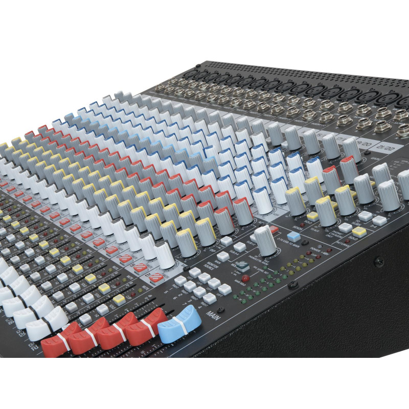 - 14 mono input channels with gain control, 3-way EQ with semi-parametric mid band, low cut and pan control