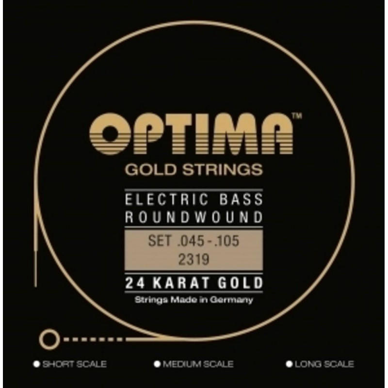 Round wound Gold Bass strings:24 Karat gold plated. Long scale 34'' = 88cm. Available in 4 different tensions and as set for 5-string basses. Suitable for allergy sufferers. Made in Germany. 2319. Medium light. .045 .065 .080 .105.