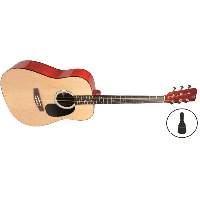 6-STRING ACOUSTIC GUITAR Dreadnought acoustic guitar. Basswood top, Basswood back and sides. Maple neck Fingerboard and bridge of 'compound rosewood'. Die-Cast chrome headstock. Natural finish. Case included.