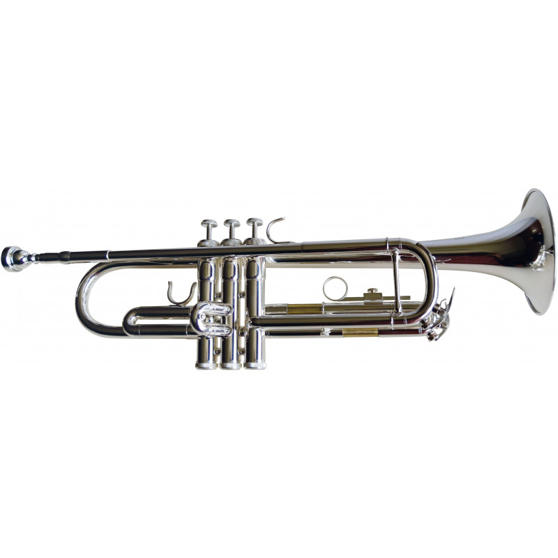 TRUMPET Bb Trumpet. ML pipe. Bell: golden brass. Tudel: golden brass. Gold-plated brass exterior for pumps. Pistons: stainless steel. Reinforcement pillar for main pump. Adjustable ring on third pump. Thumb ring on the first pump. 2 drain keys. Silver finish. Accessories included: standard 7C nozzle, cleaning kit, piston oil and ABS case with pocket and straps.