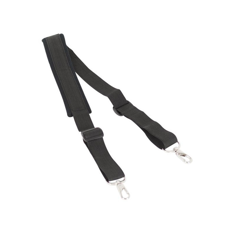 Nylon marching bass drum shoulder strap. 2 metallic snap hook.Width 35mm. Padded. Minimum length 88cm. Maximum length 140cm.