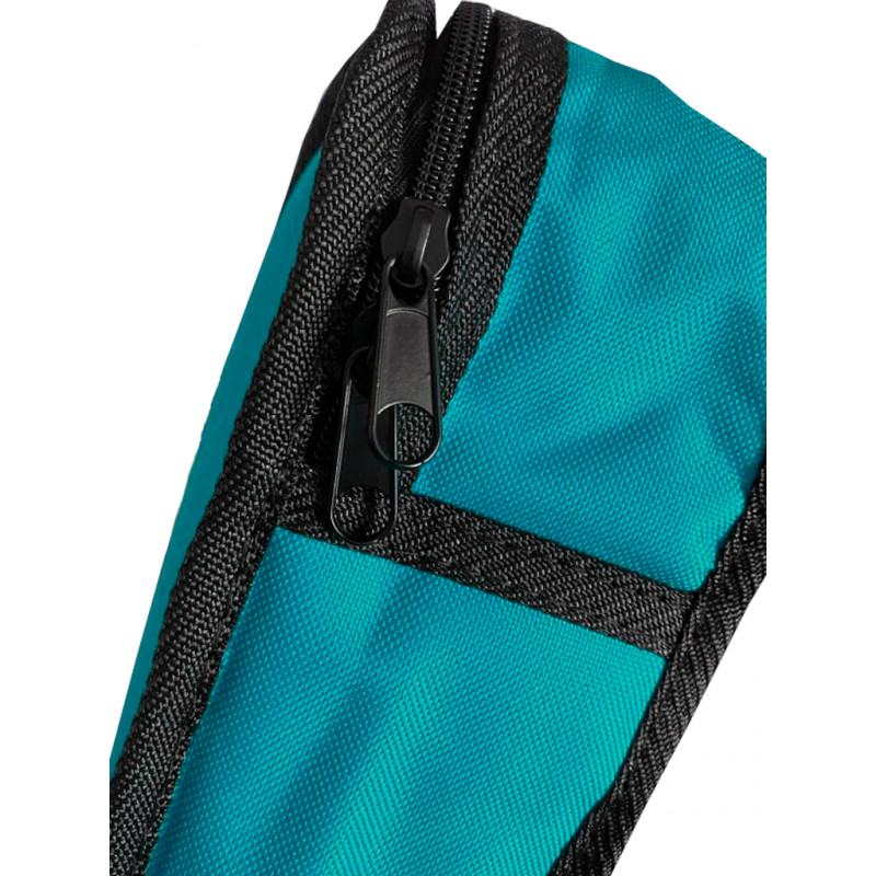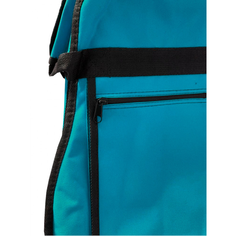 Cover for 3/4 size guitars made entirely of polyester in a turquoise tone with some black finishes, the side zipper extends along the entire right side allowing a comfortable opening to facilitate the storage of the instrument, it has 2 handles which allow the use of a lock for safe storage of the instrument, it also has a wide front zippered pocket to store parts. It also has a comfortable handle on the left side to carry it by hand.