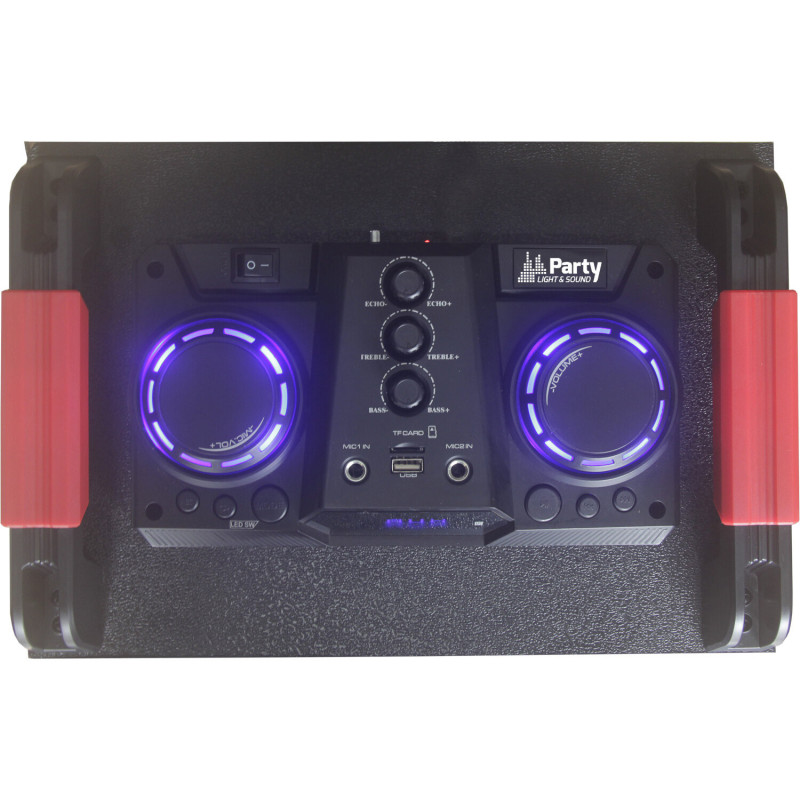 This column type speaker is designed especially for entertaining evenings. It is delivered with a cable microphone for the Karaoke function and it is simply enough to connect a second microphone to organize duets. Equipped with two wheels on the back, it makes it easy to move. The wooden casing ensures a rich and powerful sound with impressive bass.