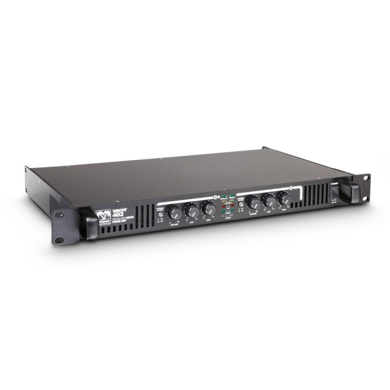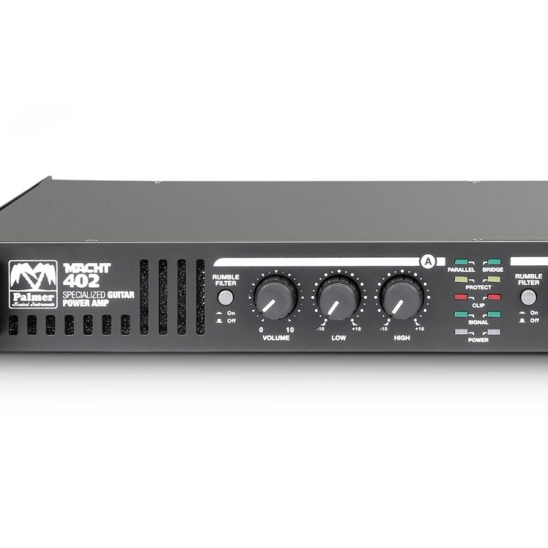 The Palmer MACHT 402 is a 19" stereo power amplifier specially designed for guitar applications. It pumps out 200 watts per channel and 400 watts bridged to drive virtually all speaker cabinets. Featuring a highly efficient switch mode power supply and low noise fan the soft start class D design is protected against overvoltage, DC, short circuits and overheating.