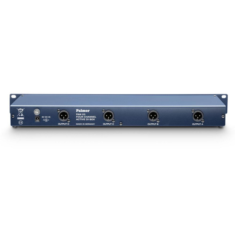 Active 4-channel DI box. Each channel has a jack input with a parallel output for passing through the signal. An attenuation switch (-30 dB) allows either a line or loudspeaker signal to be connected.Active 4 x DI box, 19" format. Technical specitications identicl to the PAN-02, however, the PAN-03 is built for mains operation. All connections and switches are located on the front panel, an additional parallel XLR output is located in back. 19 inch rack-mount format, 1 rack space, 90 mm front to back.