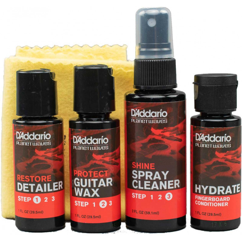 View larger GUITAR-LOW MAINTENANCE KIT Planet Waves Kit consisting of a selection of instrument care products and accessories. Includes the 3 steps of polishing, protection and cleaning (Detailer, Guitar wax and Spray cleaner) as well as a moisturizer and fingerboard cleaner (Hydrate) and a cotton suede (Polishing Cloth) specially developed to not mark your instrument when using the products . All these products are presented in 30ml plastic bottles except the 60ml Spray Cleaner in spray format. All these products can also be purchased separately.
