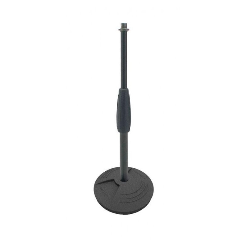 TABLE MICROPHONE STAND Table-top straight micro stand with steel base and adjustable height. Includes anti-vibration rubber ring. Outside diameter: 150mm. Height: 235 to 362 mm. Matte black finish. Weight: 1.9 Kg.