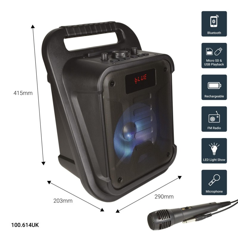 | Input connections | Bluetooth, USB, Micro SD (TF), AUX (3.5mm Jack), MIC (6.3mm), Guitar (6.3mm), Micro USB (DC 5V / 2A - charge only) |