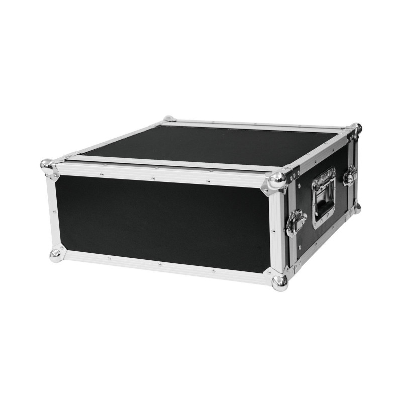 Flightcase for 483 mm units (19")The ROADINGER CO DD Effect Rack with four height units is ideal for safely storing your 483 mm control and effect units. The two lids are removable and it includes built-in rack rails.The high-quality workmanship with multi-layered glued wood is underlined by the aluminum profile frame with rounded corners. The three-legged, medium-sized steel ball corners and the four large, steel-reinforced rubber feet provide the necessary stability. In addition, the flight case is equipped with two chrome-plated case folding handles and four snap locks with eyelets for locking.The delivery includes mounting screws.The maximum load is 20 kg.