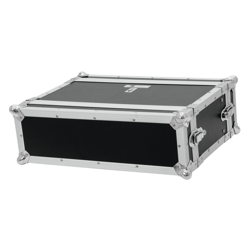 Flightcase for 483 mm units (19")Transport your 483 mm control and effect units (19") easily and safely with the ROADINGER effect rack CO DD. Two removable lids (double-door version), four large, steel-reinforced rubber feet and built-in rack rails make handling with the flightcase easy and comfortable.Multi-layered glued wood, the stable aluminium profile frame with rounded corners and three-legged, medium-sized steel ball corners give the case stability.The flight case is equipped with four snap locks with eyelets for locking, built-in rack rails and a case handle. The maximum load is 25 kg.