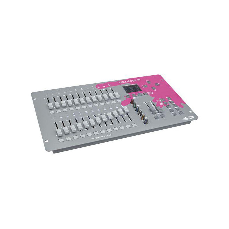 The ColorCue 3 offers two grand master faders, 24 fixture intensity faders, 6 colour rotary encoders, 24 memory buttons for colours/chases/user memories. User patchable fixtures from single dimmer till full 6 colours in different variations.