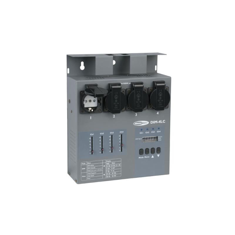 The DIM-4 can be fully controlled by DMX but has as well an built in chaser as well a sound-control function. For easy use in any location the DIM4LC has 4 local control faders which makes it a powerful and compact dimming pack for numerous applications.
