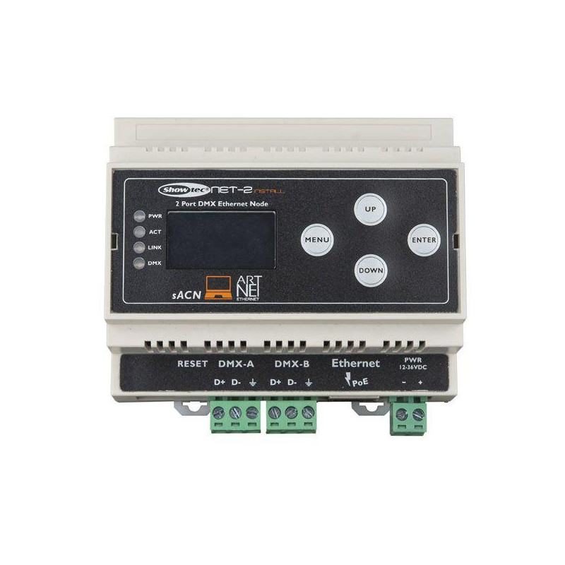 The Showtec NET-2 Install is the ideal compact fixed-installation node for you. All connections are easy connectable with the plug-in Phoenix terminals, and both bi-directional DMX ports are optically isolated to prevent any interference from getting hold of your signal. Power can be supplied via PoE or on the wide range DC power input. A maximum of 1024 channels can be transported over a single CAT5. All settings can be done by the easy-to-use menu on the graphic display and buttons on the front or via the remote web interface which can be accessed within the network. Default login account: Admin, password: Admin. The din-rail mounted NET-2 converts ArtNET or sACN to DMX512 and back, and is ideal for network system integration projects.