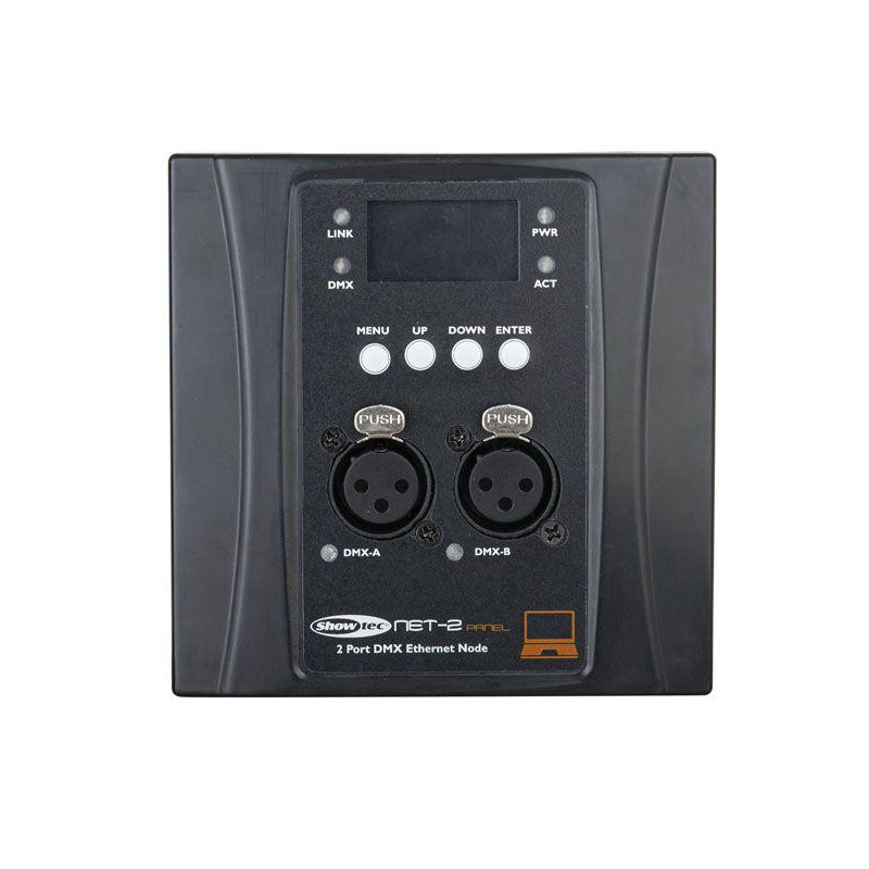 The Showtec NET-2 Panel nodes are cutting-edge network routing devices which convert ArtNET or sACN to DMX512 and back. These wall-panels are ideal for making multiple patch points for DMX inputs or outputs in your Professional Theatre, School, University, Convention Hall, Club or Church. The power can simply be provided via the NET-5 PoE switch or by using a local small in-wall power-supply. A maximum of 1024 channels can be transported over a single CAT5. All settings can be done by the easy-to-use menu on the graphic display and buttons on the front or via the remote web interface which can be accessed within the network. Default login account: Admin, password: Admin. As a DMX input point you can use it as a normal input or backup input. The DMX outputs options are normal, merging HTP/LTP. The NET-2 panel fits a normal masonry 3,5” back box or European U50 wall box.