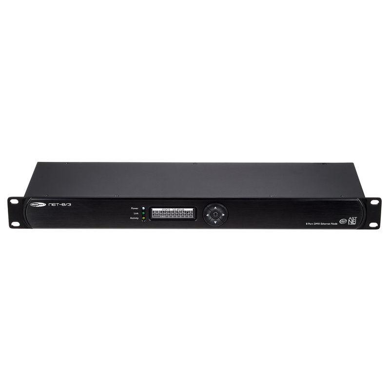 The Showtec NET-8/3 and NET-8/5 nodes are cutting-edge network routing devices which convert ArtNET to DMX512 and back. A maximum of 4096 channels can be transported over a single CAT5. This makes the NET-8/x suitable for small to large scale events. The NET-8/x embeds a built-in network switch to allow it to be used as a Ethernet repeater as well as 8 isolated DMX-512 universes which can be used as a input or output. All settings can be done by the easy-to-use menu on the graphic display and buttons on the front.