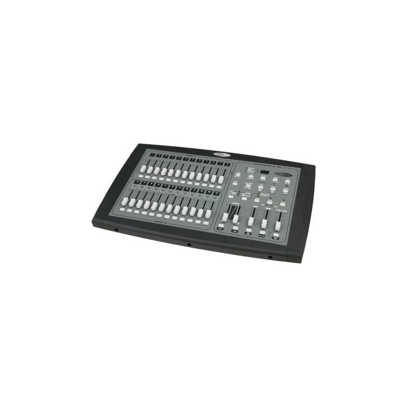 The Showmaster 24 MKII is a 2-banks 12 fader, 1-bank 24 fader mixing console, it controls DMX and has also the capability to be used with MIDI protocol to allow real-time programs. The Showmaster 24 MKII controls 2x 12 channels (single bank) or 24 channels. The Showmaster 24 MKII can program 48 scenes or chases of 999 steps or a loop with a total of 11988 steps. Programs can be run automatically or by external or internal music-input. It is also possible to control your lightshow by the built in MIDI-interface to allow a real-time live-show to your music.
