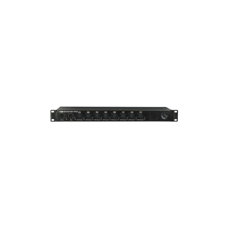 The Booster Pro is the ultimate DMX tool which should be in the equipment rack of each rental company or installation. The Booster Pro is an optical isolated DMX Splitter and Booster. The Booster Pro has 2 inputs which can be patched to 8 selectable output (for each output you can patch input A or B). The Booster Pro is fully RDM compatible and offers real-time DMX monitoring. For specialist applications the DMX timing can be adjusted. Furthermore each output of the Booster Pro has a monitoring function which controls the status of the connected cables real-time. In case of any failure an acoustical signal will warn the user. The intuitive OLED display lets you set all the different function fast and easily.
