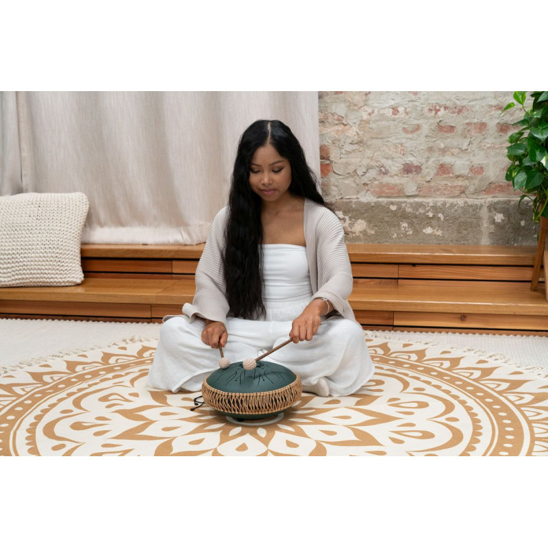 STEEL TONGUE DRUMS 'The Meinl Sonic Energy 10'' Mid Octave Steel Tongue Drum is made of high quality stainless steel. Its eight octave notes deliver the tones in two octaves. This creates a wonderful, meditative sound similar to the tone of a handpan. A mouth located at the bottom of the drum can be sealed with a silicone plug to provide an even more compact sound. Three silicone feet on the bottom prevent the drum from slipping. The mid-octave steel tongue drum can be played with fingers or mallets. Getting Started To play, simply place it on a flat surface or on your lap. The drum comes with two wooden mallets with soft rubber heads and a nice carrying bag with a zipper and handle. Ethereal tone, Reflective sound features, Non-slip feet, Decorative linen/nylon cord. Sizes 10''/25cm diameter, 5.5''/14cm height'