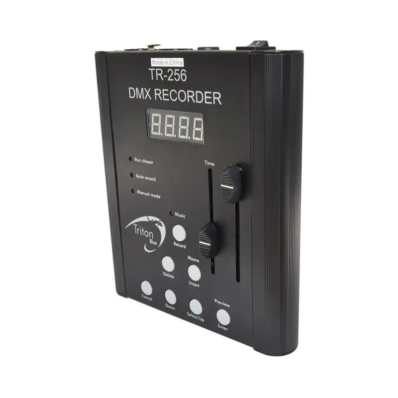 The Triton Blue TR-256 is a professional DMX recorder and player designed to easily and precisely control and automate DMX lighting effects. It allows you to manage up to 256 DMX channels , compatible with moving heads, scanners, smoke machines, lasers, and pyrotechnic effects , among others.