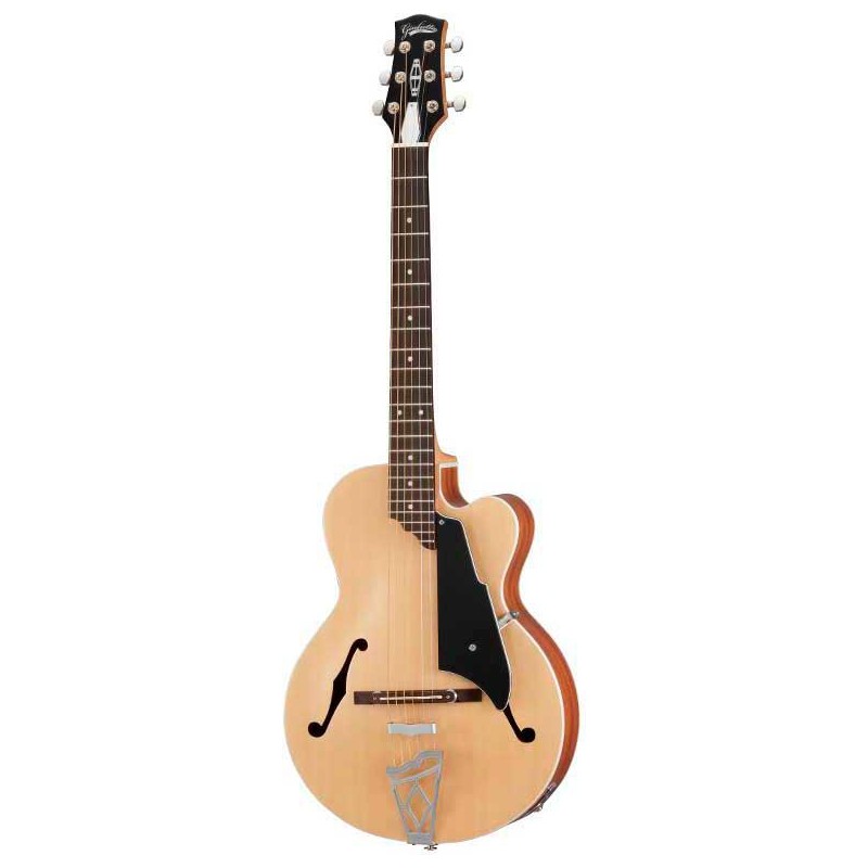 HOLLOW BODY GUITAR The new VOX Giulietta acoustic / electric guitar features a classic archtop design along with modern playing features and state-of-the-art sound quality. 24.75 '' scale length. 13.5 '' wide body with spruce archtop, mahogany back and sides. 22 frets. Mahogany neck. New VOX Super Capacitor preamp system coupled with a high-quality piezo pickup. Volume and tone control. Active / passive selector. Mini USB Jack for charging the pre-amplification system. Includes cover.