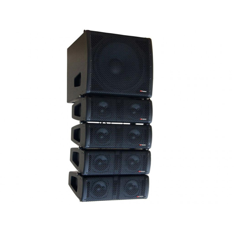 The subwoofer integrates the bi-amplified power stage and a 15 "woofer specially designed to enhance low frequencies, being able to be placed as a line array or as a subwoofer reinforcement using the 35 mm insert of its base Each satellite has a 5" speaker and 1 "driver for the middle and treble bands respectively.The trapezoidal shape.The bi-amplified power stage has both elements, subwoofer and satellites, are made of plywood and with a splash-resistant paint layer. of front safety pins as well as a system for adjusting the vertical dispersion at an angle between -2 ° and 15 °, allowing great versatility in obtaining the desired curve.