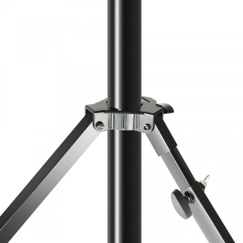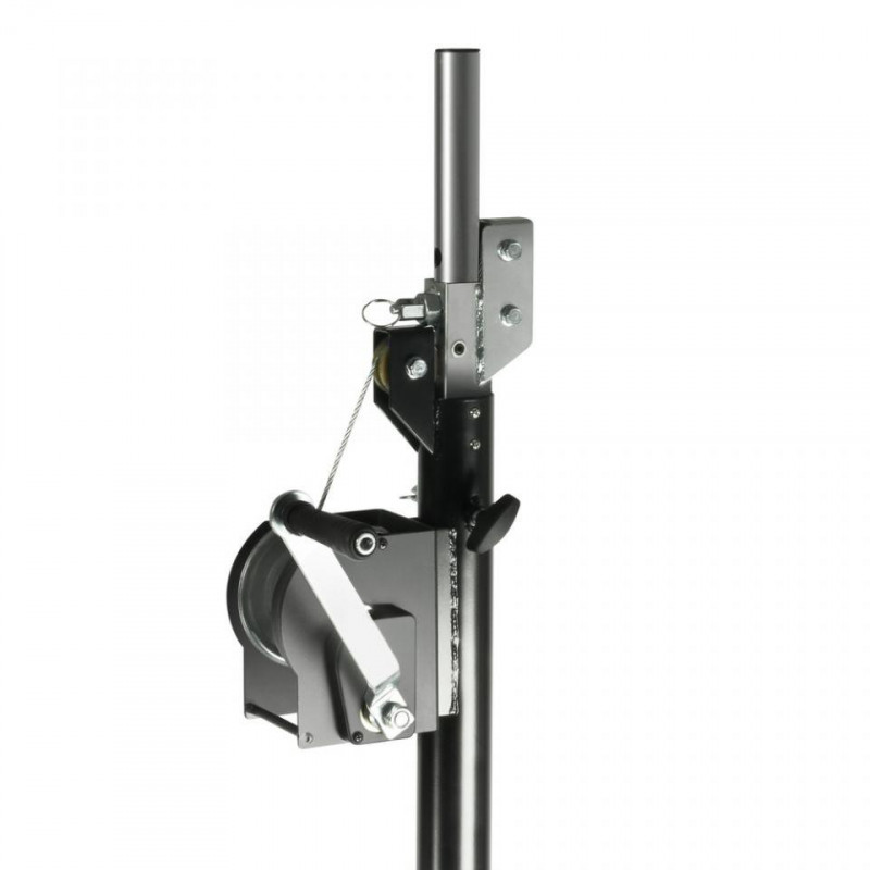 The sturdy steel construction has a black powder-coated finish; the upper tube and extensions are galvanized. A levelling foot ensures secure positioningof the wind up stand even on uneven surfaces. All adjustable elements are secured with spring bolts in addition to the tommy screws. The SWU400T weighs 19.7 kg and is extendable from a minimum height of 190.5 cm to a maximum of 4m.