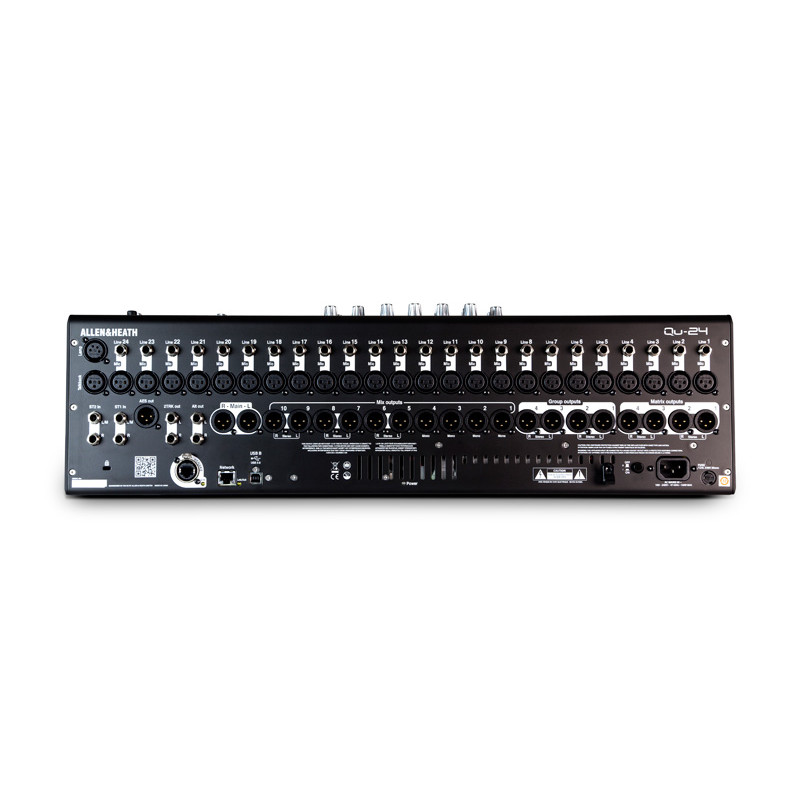 Con su pantalla táctil de excelente respuesta, 25 faders motorizados y los reconocidos preamplificadores recuperables AnalogiQ, Qu-24 combina una excepcional facilidad de uso con una calidad de sonido impecable. Basándose en las tecnologías y flujo de trabajo utilizados en los sistemas GLD e iLive, Qu ofrece el sistema de mezcla digital más accesible y compacto hasta la fecha. Esta nueva Chrome Edition incluye Mezcla Automática de Micrófonos, más mezclas de monitores, Espectrograma para ayudar a eliminar la realimentación acústica, y nuevos controles metálicos de alto contraste´ Los 24 preamplificadores AnalogiQ con total recall de Qu-24 ofrecen detección de paso por cero y una avanzada etapa de ganancia sin pad y por pasos de 1 dB, íntimamente relacionado con el DSP para obtener una óptima precisión en la ganancia y la máxima transparencia de audio. La señal analógica es capturada por conversores analógico / digital de baja latencia con resolución de 24 bit, combinados con conversores digital / analógico de alta calidad, también con una resolución de 24 bit, para proporcionar la salida adecuada. El diseño AnalogiQTM ha sido refinado tras muchos meses de trabajo para ofrecer la máxima transparencia, la mínima distorsión y un extremadamente bajo suelo de ruido, con un sonido cálido y musical del que carecen la mayoría de consolas digitales. La pantalla táctil de 800 x 480, y 16 millones de colores, y su codificador de datos forman el corazón del interface de la Qu-24, proporcionando un acceso súper rápido y fácil a todos los ajustes. El interface de usuario ha sido diseñado para ofrecer la máxima claridad. Las teclas específicas y las pestañas en pantalla guían rápidamente al usuario hacia las visualizaciones del RTA, los racks FX, el procesado de canales, el control de audio USB, escenas, menús de configuración y mucho más. Todas las herramientas clave para el procesado se presentan de forma clara en el SuperStrip, con una función para cada control físico. El SuperStrip se complementa con un Canal Táctil presentado en la pantalla, que ofrece un acceso intuitivo a todos los parámetros de procesado, sin necesidad de navegar a través de complejas estructuras de menú. El procesado para las entradas mono y estéreo incluye Trim, polaridad, HPF, Gate, inserción, PEQ de 4 bandas, compresor y retardo. La mezcla principal LR y las mezclas mono disponen de inserción, GEQ de 1/3 de octava, compresor y retardo. Las mezclas estéreo disponen de inserción, PEQ de 4 bandas, compresor, retardo y control de balance. Qu-24 incorpora 25 faders ALPS motorizados, 24 de ellos distribuidos en 2 capas, permitiendo acceso instantáneo a todos los canales y masters en un espacio compacto, además de un fader master que sigue de forma dinámica la sección de mezcla. Está disponible una tercera capa personalizada, que permite que el usuario cree su propia combinación de entradas, envíos FX, retornos FX y mix masters. La consola dispone de 10 SoftKeys a las que el usuario puede asignar funciones, tales como el enmudecimiento de grupos, Tap tempo, navegación a través de las escenas o borrado de PAFL. La Matriz que incorpora Q-24 añade 2 salidas estéreo equipadas con procesado completo. Qu-24 dispone de un grabador USB multipista integrado, proporcionando 18 canales de grabación y reproducción directa de / hacia USB con una resolución de 24 bit, 48 kHz. Puede grabarse un par estéreo seleccionado junto a los 16 canales mono, y el audio multipista puede ser reproducido a los 16 canales mono, además de ST1. Qu-Drive proporciona también grabación estéreo, que puede tomarse desde cualquier par de salidas Mix, la salida LR principal (pro, post o sumada a mono) o incluso el bus PAFL, con reproducción estéreo sobre ST3. Los procesadores de dinámica y FX que incorpora Qu-24 proceden de los utilizados en la serie iLive. Algunos de los ingenieros de audio más respetados del mundo han escogido utilizar los FX de iLive en sus giras. Qu-24 incorpora 4 motores FX estéreo de iLive, que ofrecen las legendarias emulaciones de reverbs clásicas, reverbs puerteadas, retardos, moduladores, flangers y mucho más. Los FX son retornados a la mezcla a través de canales de retorno específicos, por lo que no es necesario ocupar canales mono o estéreo para este menester. Cada retorno estéreo de FX dispone de su propio PEQ de cuatro bandas. Qu-16 puede almacenar hasta 100 escenas completas que pueden ser recuperadas a voluntad. Los canales y mezclas pueden ser preservados frente a la recuperación de escenas. El Mezclador Automático de Micrófonos (AMM) es vital en aplicaciones tales como conferencias, reuniones, etc, donde están abiertos de forma simultánea varios micrófonos, reduciendo el ruido de fondo y minimizando el riesgo de que se produzca realimentación acústica. El Mezclador Automático de Micrófonos ayuda al ingeniero a gestionar los niveles de múltiples entradas microfónicas, asegurando que todas las locuciones son escuchadas de forma adecuada. El algoritmo D-Classic de reparto dinámico de ganancia está inspirado en los mezcladores automáticos estándar de la industria. Pueden ser mezcladas de forma simultánea hasta 16 fuentes microfónicas, con ajuste de prioridad en cada canal, que determina el ‘peso’ en la ganancia total del sistema. El interface incorporado en Qu-24 hace stream de hasta 32 pistas seleccionables hacia un ordenador Mac o PC. El retorno desde el ordenador puede ser fácilmente asignado a los canales de entrada. El interface es compatible con Mac OS X. También será reconocido de forma inmediata por cualquier DAW que soporte Core Audio, incluyendo Logic, Cubase, Reaper y Pro Tools. También está disponible un dirver compatible ASIO y WDM para ordenadores Windows. El control MIDI estándar es tunelado sobre una conexión USB, lo que permite mapear fácilmente los faders a las pistas de cualquier DAW. Está disponible un driv