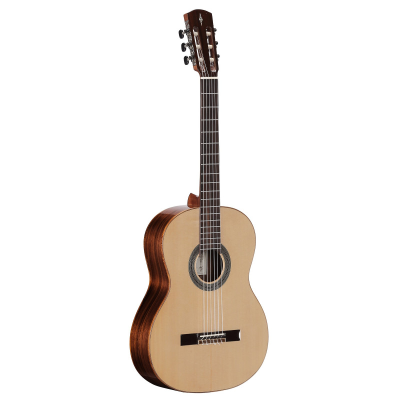GUITARRA CLASICA Guitarra clásica. Tapa maciza de abeto Sitka AA. Mástil de tres piezas de caoba, ébano y caoba. Aros y fondo de nogal negro. Construcción en abanico asimétrico. Puente de dos niveles de palorrosa y laurel de la India. Diapasón de palorrosa y laurel de la India. Cejuela y silleta de hueso real. Clavijeros cromados con clavijas de ébano. 19 trastes. Escala 25 63/64”. Binding de acacia. Cuerdas D´Addario Pro Arte EXP46. Acabado Natural Gloss.