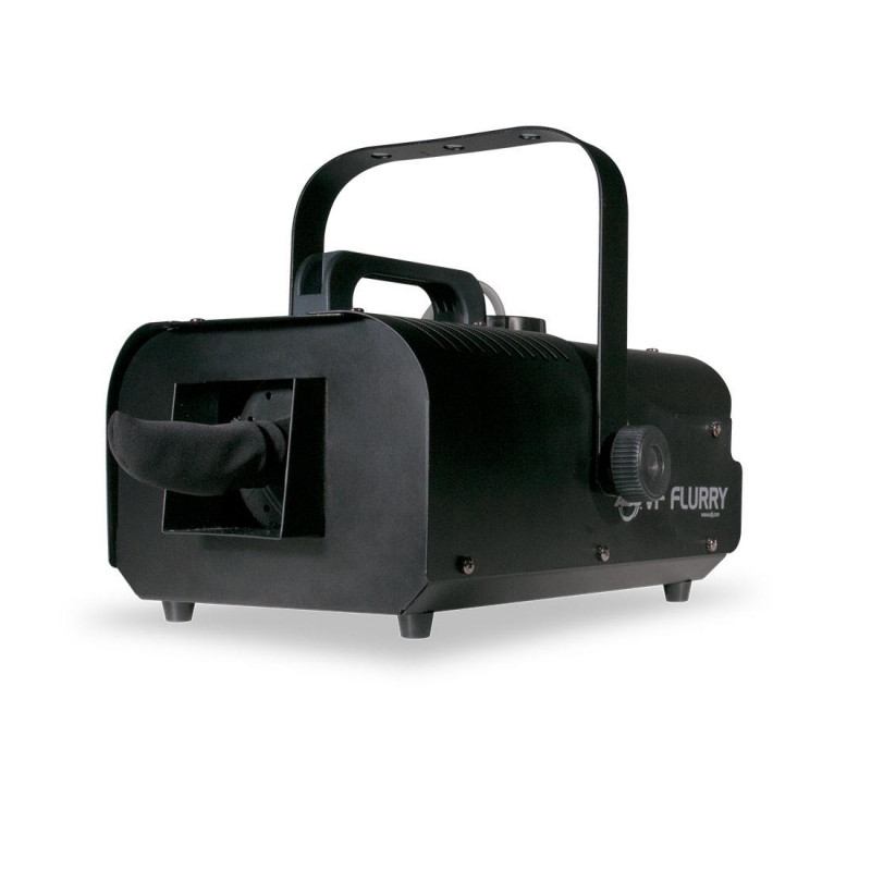 El VF Flurry es una máquina de nieve de 600W muy eficiente. Tiene una distancia de pulverización de 2-5 metros. Las características incluyen: Interruptor Alto/Bajo volumen, apagado automatico cuando este bajo de líquido para proteger la bomba, indicador de nivel de líquido de nieve, tanque de 1 litro de fluido nieve interno, y un interruptor de encendido/apagado en el panel posterior. El Flurry VF utiliza fluido de nieve a base de agua.