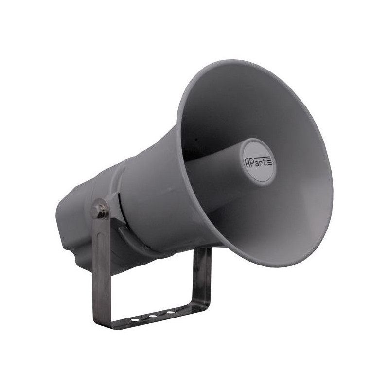 El HM25-G es un potente altavoz de tipo bocina equipado con un transductor de compresión, de construcción totalmente metálica (incluso la parte interior de la bocina es metálica), que ofrece un sonido excepcionalmente claro. Se trata de una unidad única en el mercado. Incorpora un transformador de 100 V, de alta calidad, que dispone de tres tomas de potencia y un conmutador de corte por sobrecarga térmica. La tecnología APart evita la sobrecarga del amplificador gracias a su dispositivo interno de protección IMC. Este circuito controla la impedancia del altavoz, incluso más allá de su gama de frecuencia nominal, y protege a los amplificadores de 100 W frente a sobrecargas. Los dobles prensores de cable facilitan el cableado y la conexión del HM25-G. Su carcasa es totalmente impermeable; se suministra con un soporte de aluminio que también está protegido frente a la corrosión, convirtiéndolo en la solución ideal para ser utilizada en exteriores, en aplicaciones de megafonía y señales de alarma en lugares donde existe un elevado nivel de ruido ambiental.