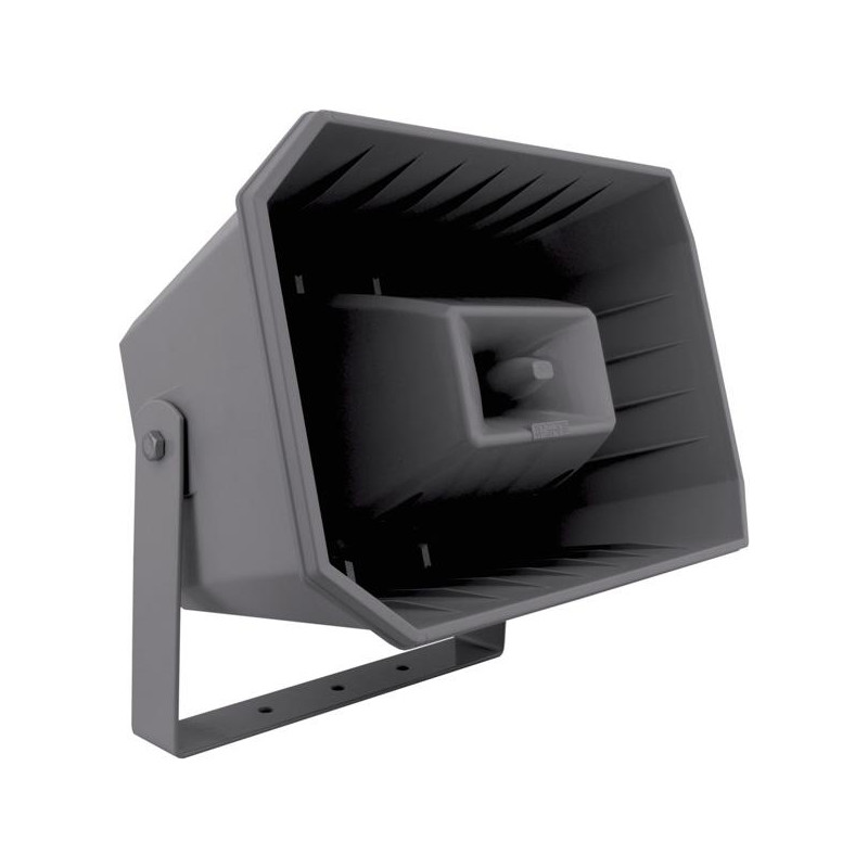 El MPLT62-G es un proyector de sonido de 2 vías, muy potente y de alta calidad, para línea de 100 V. Dispone de una salida de gran cobertura (long throw) que ofrece una alta calidad de sonido a grandes distancias y en áreas amplias. Gracias a su amplia gama de cobertura, alta sensibilidad, alta salida, baja distorsión y amplia gama de respuesta en frecuencia, este modelo de 2 vías equipado con bocina es ideal para voz, música o incluso señales de alarma. Puede utilizarse en exteriores, como por ejemplo centros de ocio, escuelas, aparcamientos, así como en grandes instalaciones tales como centros deportivos, aeropuertos, recintos de exposición, etc. Su recinto está fabricado con ABS resistente a grandes impactos. Esto hace que el altavoz sea totalmente impermeable, cumpliendo con las especificaciones IEC IP-66. Dispone también de un robusto soporte de aluminio. Como estándar, se presenta en color gris. A partir de 12 unidades, puede suministrarse acabado en cualquier color RAL.