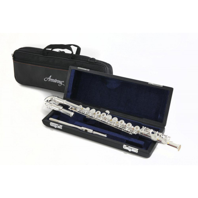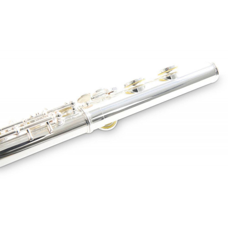 Igual que el modelo FL650RI. con cabezal recto y curvado. Cabeza. cuerpo. pata y llaves en alpaca plateada. Platos abiertos. Sol alineado. Con topes de corcho natural. Topes de fieltro blanco. Pulsación modificada bajo llave de D#. Almohadillas PISONI. Con varilla y paño para limpieza. Estuche de madera con funda.