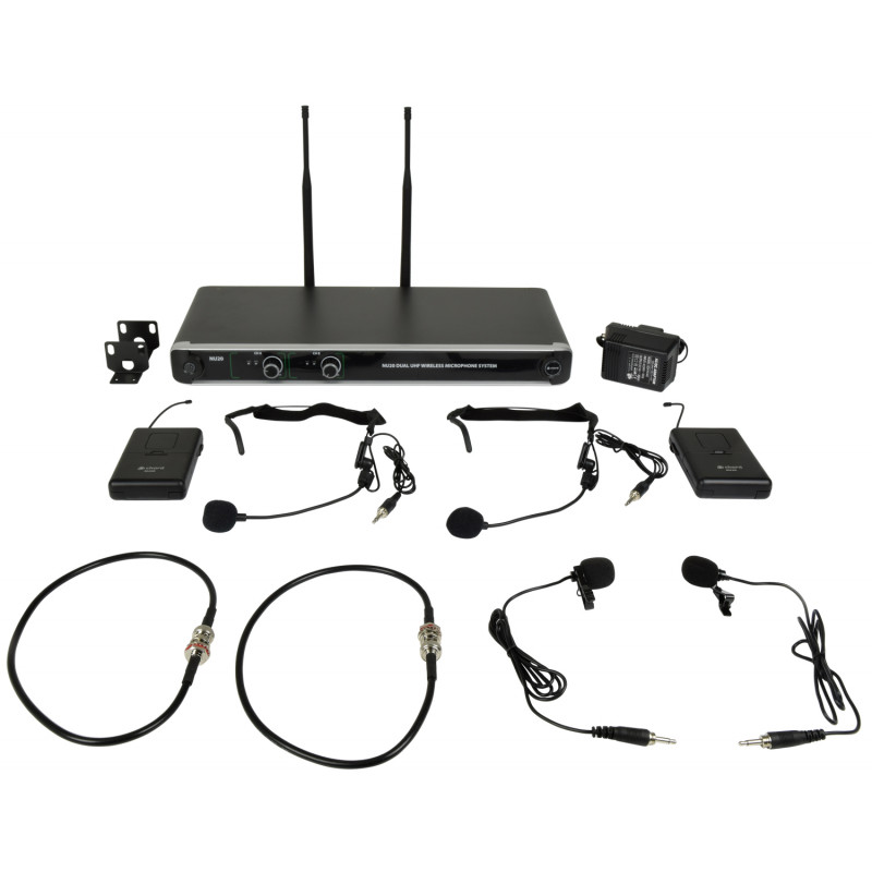 Sistema inalámbrico UHF de doble canal con 2 transmisores de petaca, 2 micrófonos de diadema y 2 micrófonos de solapa.