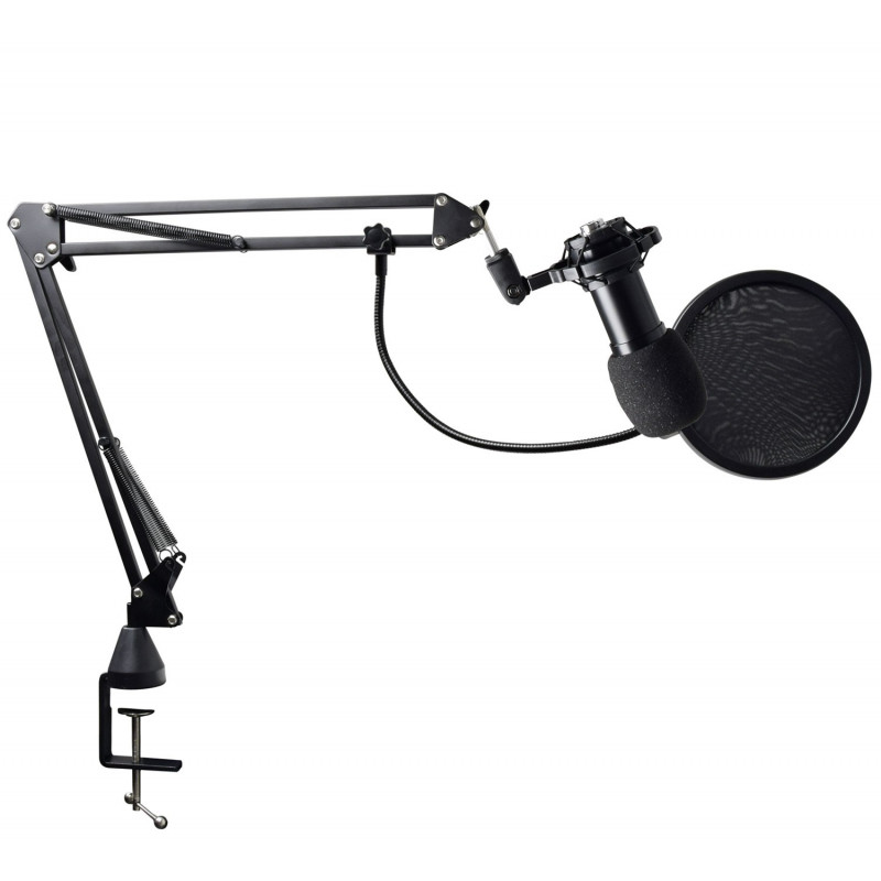 Kit de micrófono de estudio compuesto por un micrófono de condensador con soporte antivibratorio, filtro antipop, pantalla antipop, cable XLR y soporte de brazo ajustable con abrazadera. Ideal para grabaciones de audio en estudios, transmisiones en línea, podcast, etc.