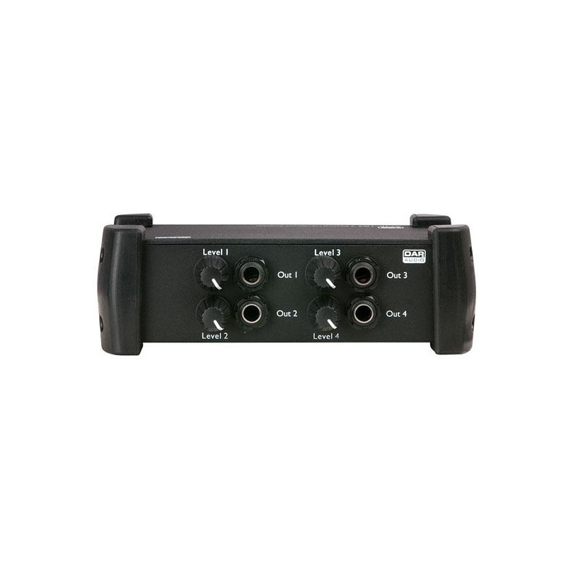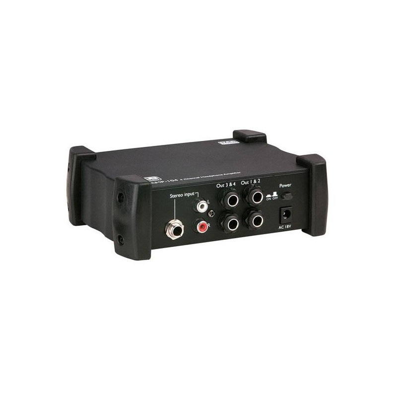 La unidad AMP-104 sirve para expandir o generar 4 canales para auriculares. Cuenta con una entrada Jack TRS estéreo de 6,3 mm, además de una entrada estéreo RCA que la convierten en una herramienta muy útil para múltiples aplicaciones. Las 4 salidas disponen de su propio control de volumen y los auriculares se pueden conectar a ambos lados de la unidad AMP-104. De esta forma es también posible conectar 8 auriculares que serán operados en grupos de 2 unidades.